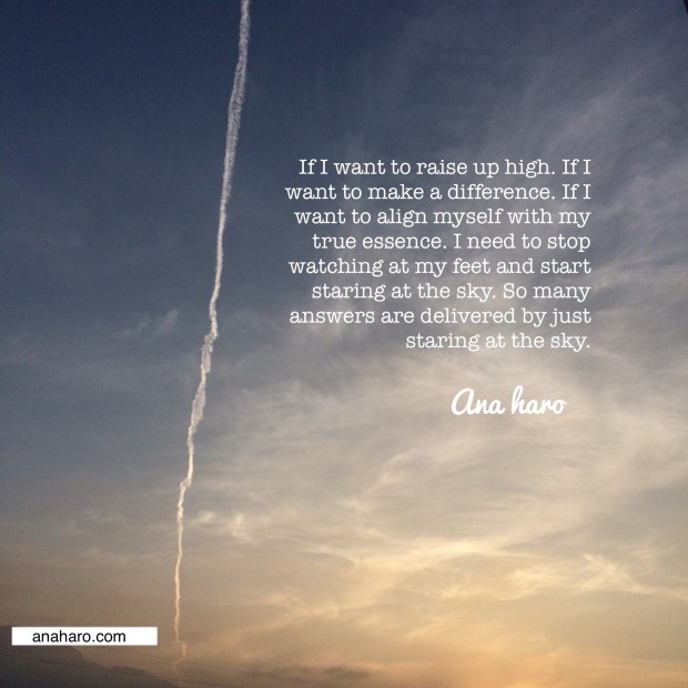 If I want to raise up high. If I want to make a difference. If I want to align myself with my true essence. I need to stop watching at my feet and start staring at the sky. So many answers are delivered by just staring at the sky.