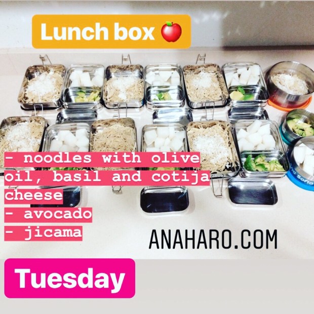 Lunch box Tuesday!🍎 10 abril, 2018 Menú de hoy! LUNCH box 🍎 – Fideos con oliva, albahaca y queso cotija – Aguacate – Jícama (la enjuago bien después de cortar o si la compro cortada también la enjuago bien, varias veces. Le tiro el agua y la dejo remojar en el refri toda la noche. La dejo en agua hasta que se termine para que no se reseque). De tomar que mando AGUA simple y sabrosa ! 😊💦💦 Con cariño Ana Haro 😘 anaharo.com @anaharomyjourney #anaharomyjourney #myjourney_ana Comparte esto: Haz clic para compartir en X (Se abre en una ventana nueva) X Haz clic para compartir en Facebook (Se abre en una ventana nueva) Facebook Me gusta Cargando...