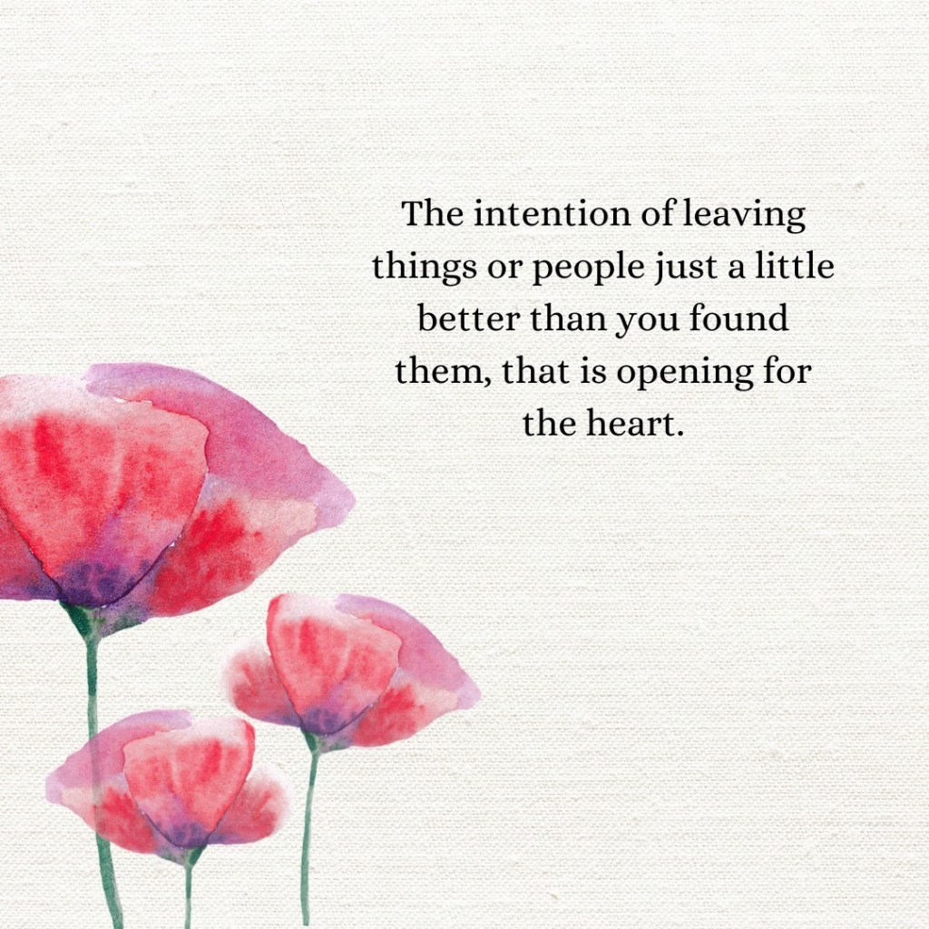 The intention of leaving things or people just a little better than you found them, that is opening for the heart. This intention is part of what dissolves those barriers that we can have between each other – barriers of fear, judgment, and conditioning.