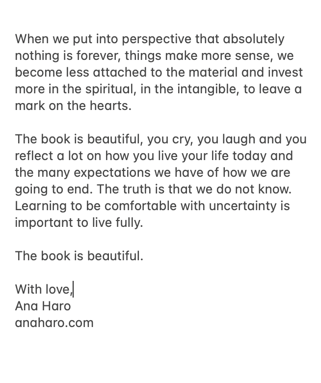 El libro es hermoso, lloras, ríes, y reflexionas muchísimo sobre como llevas tu vida hoy y las muchas expectativas que tenemos de como vamos a terminar. La verdad es que no lo sabemos. Aprender a estar cómodos con la incertidumbre es importante para vivir presentes y plenos.