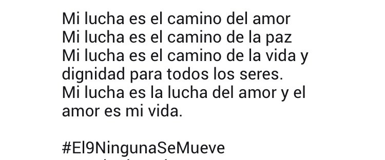 Mi lucha es el camino del amorMi lucha es el camino de la pazMi lucha es el camino de la vida y dignidad para todos los seres.Mi lucha es la lucha del amor y el amor es mi vida. Se puede ser compasivo y a la vez fiel a los principios de dignidad, justicia, equidad, … Sigue leyendo Una lucha de amor