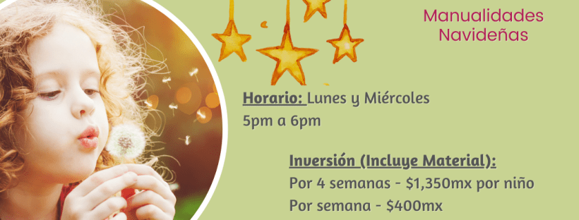 Para niños de 4 a 7 años💛 ✨Arte✨Música✨Manualidades Navideñas✨ Hablaremos de Emociones❤️ 💚Inscripciones Abiertas💛 ✨Horario: Lunes y Miércoles de 5pm a 6pm✨Inversión (Incluye Material):Por 4 semanas - $1,350mx por niñoPor semana - $400mxPor clase - $250mx ✨ Informes: WhatsApp 8113777923💻hola@anaharo.com ❤️Iniciamos 8 de Noviembre❤️ Con cariño,Ana Haroanaharo.com Salud Emocional para Mujeres y Niños💓